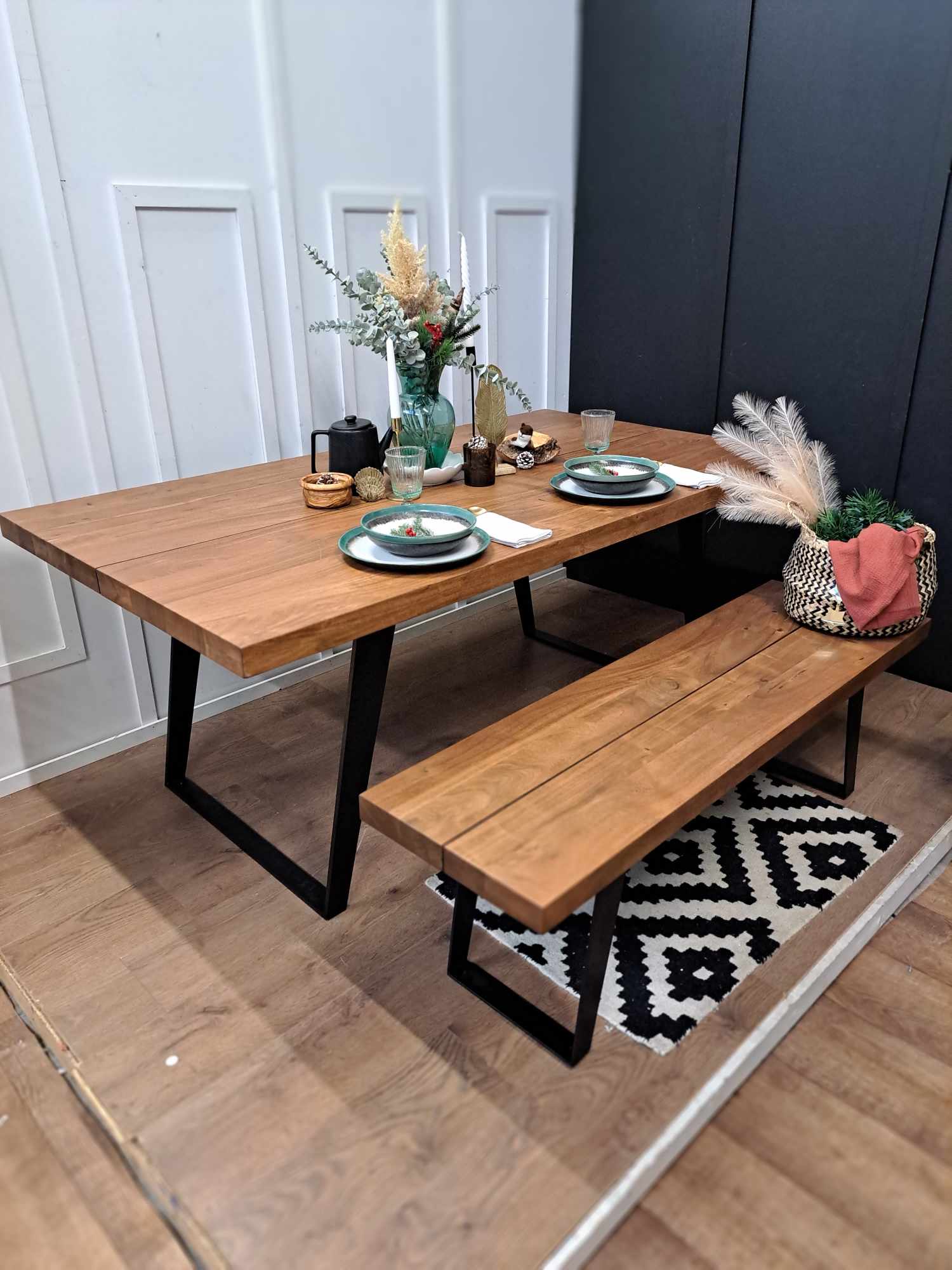 Dining Set- Solid Wood and Black Metal Dining Table and Bench Set