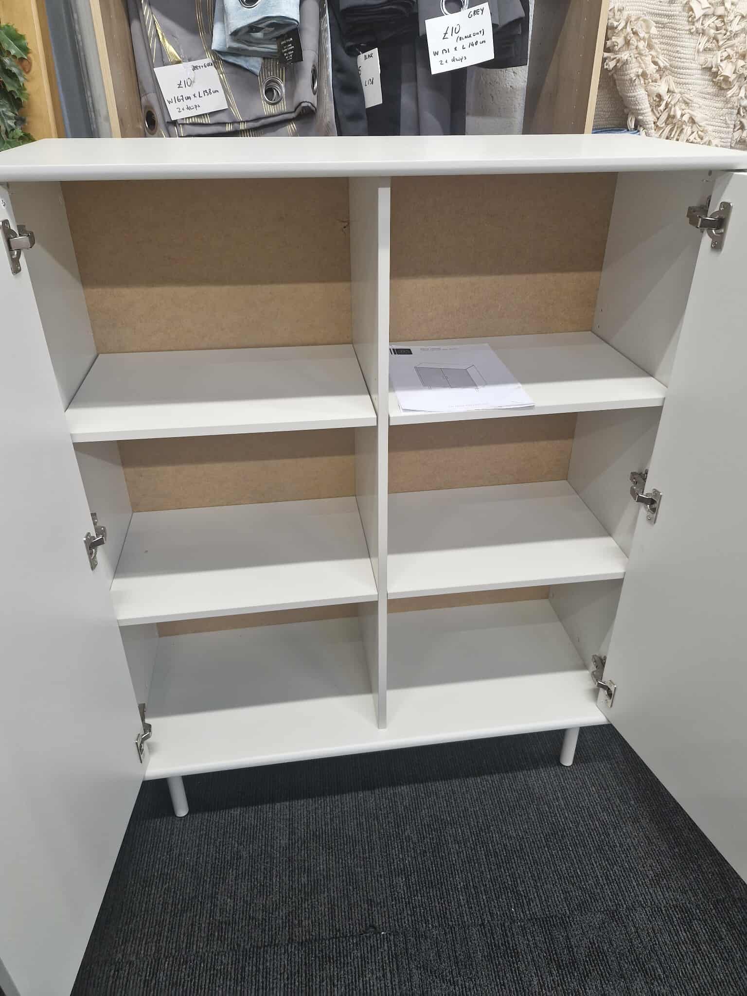 Two doors open to reveal two sleeves with a divider, giving a total of six sections for holding everything from tableware to towels