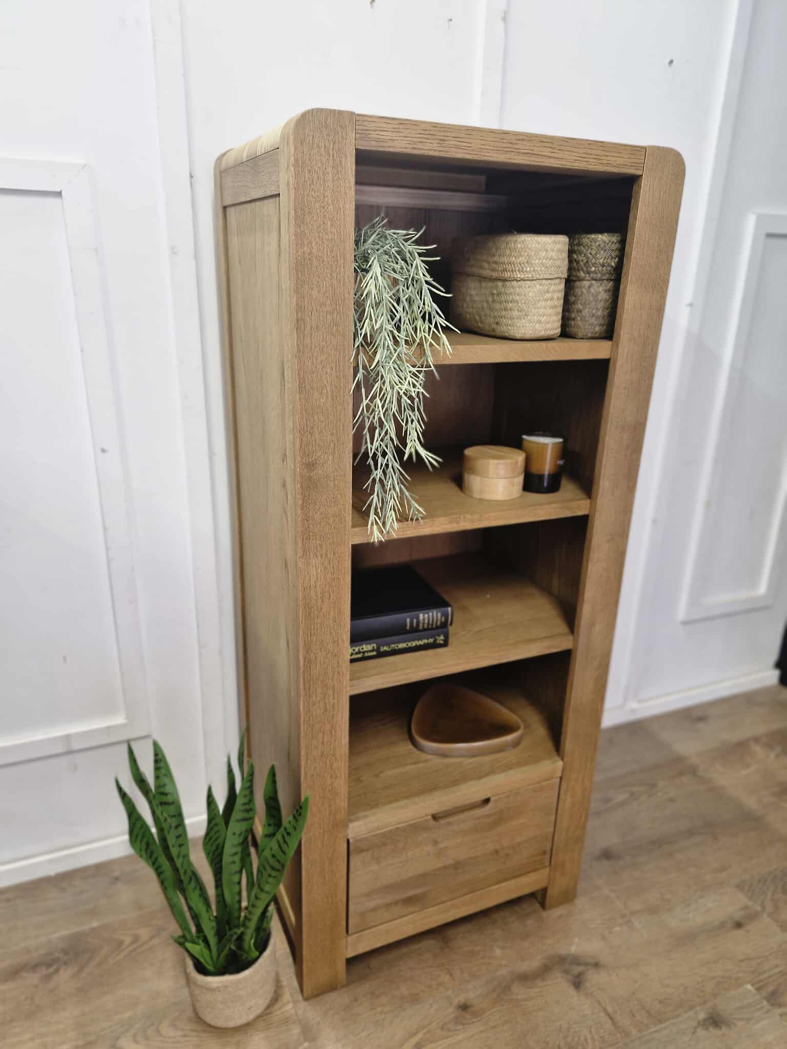 Oak Slim Bookcase / Tower Unit with drawer