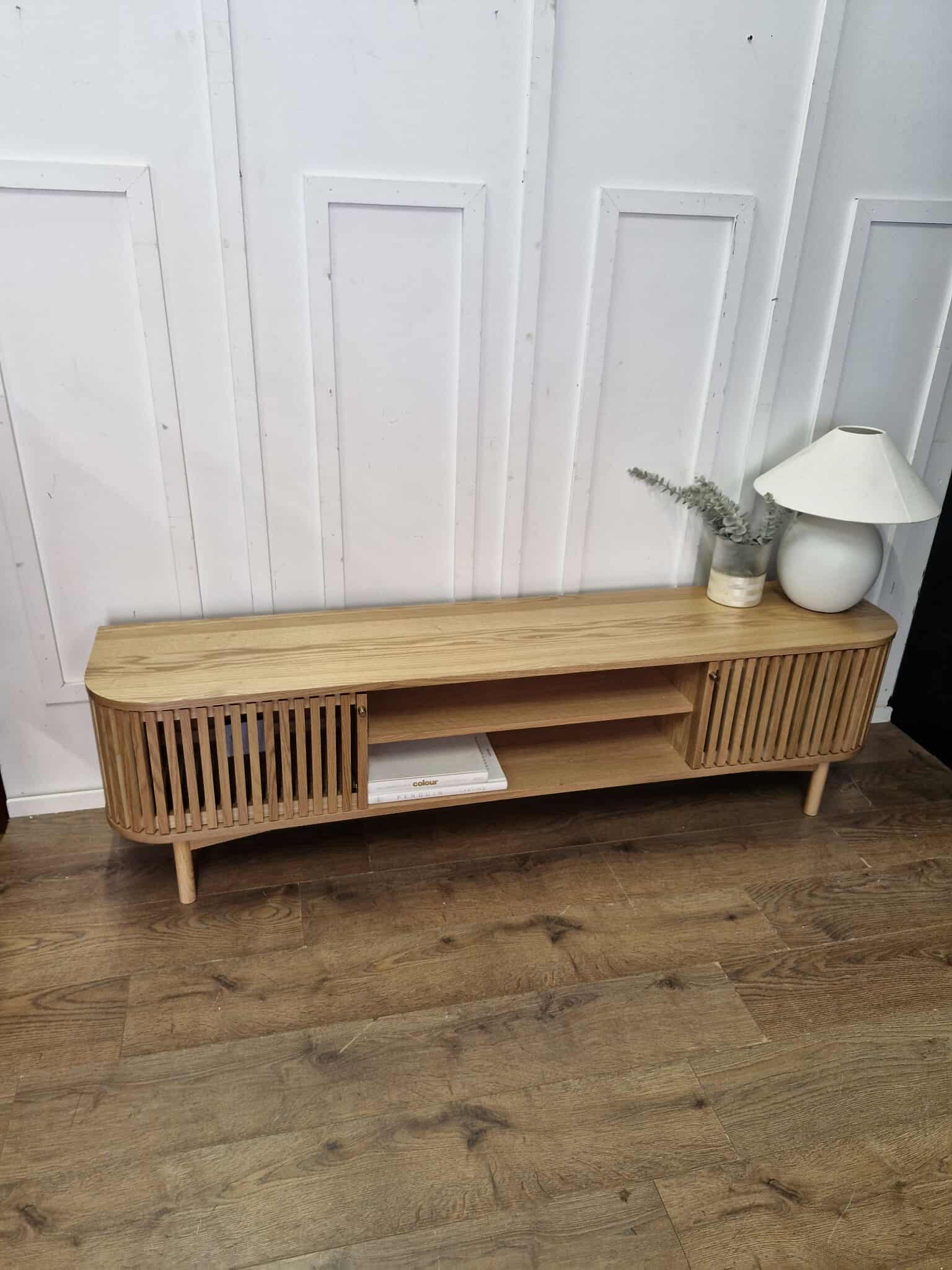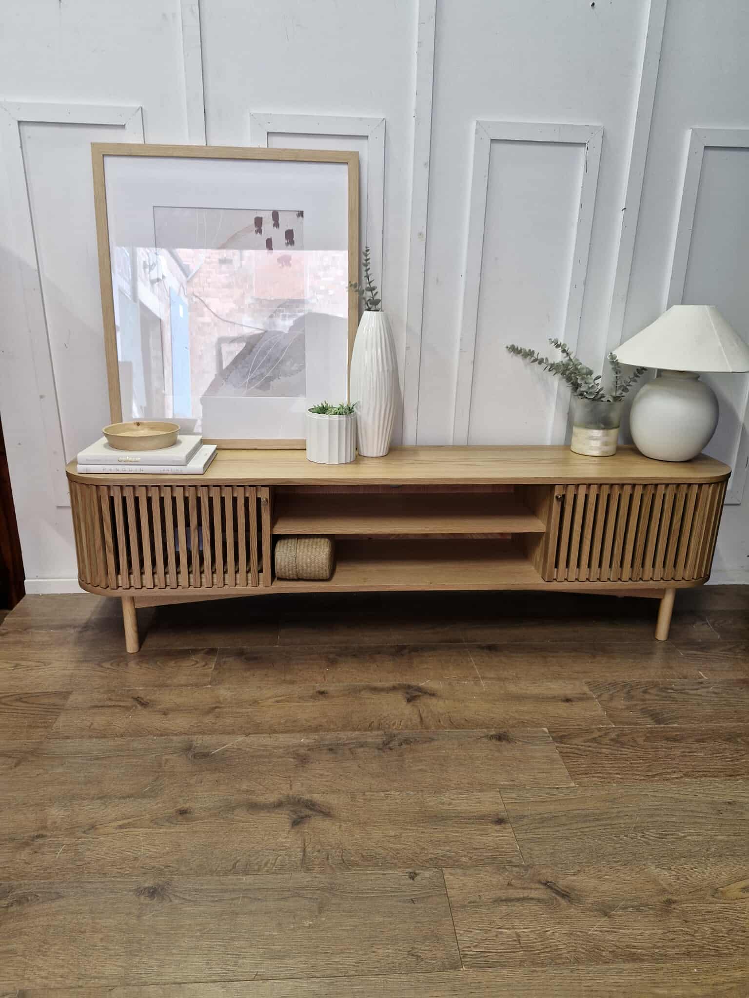 2 doors with slatted fronts and elegant gold handles, efficient cable management with a holes in the back