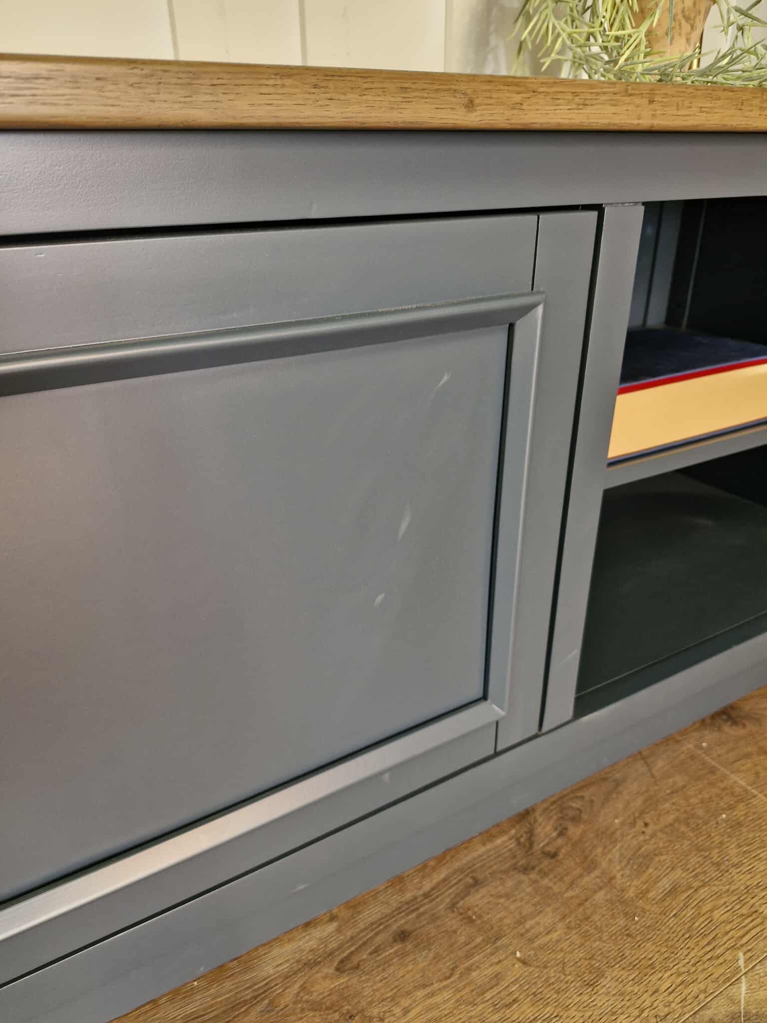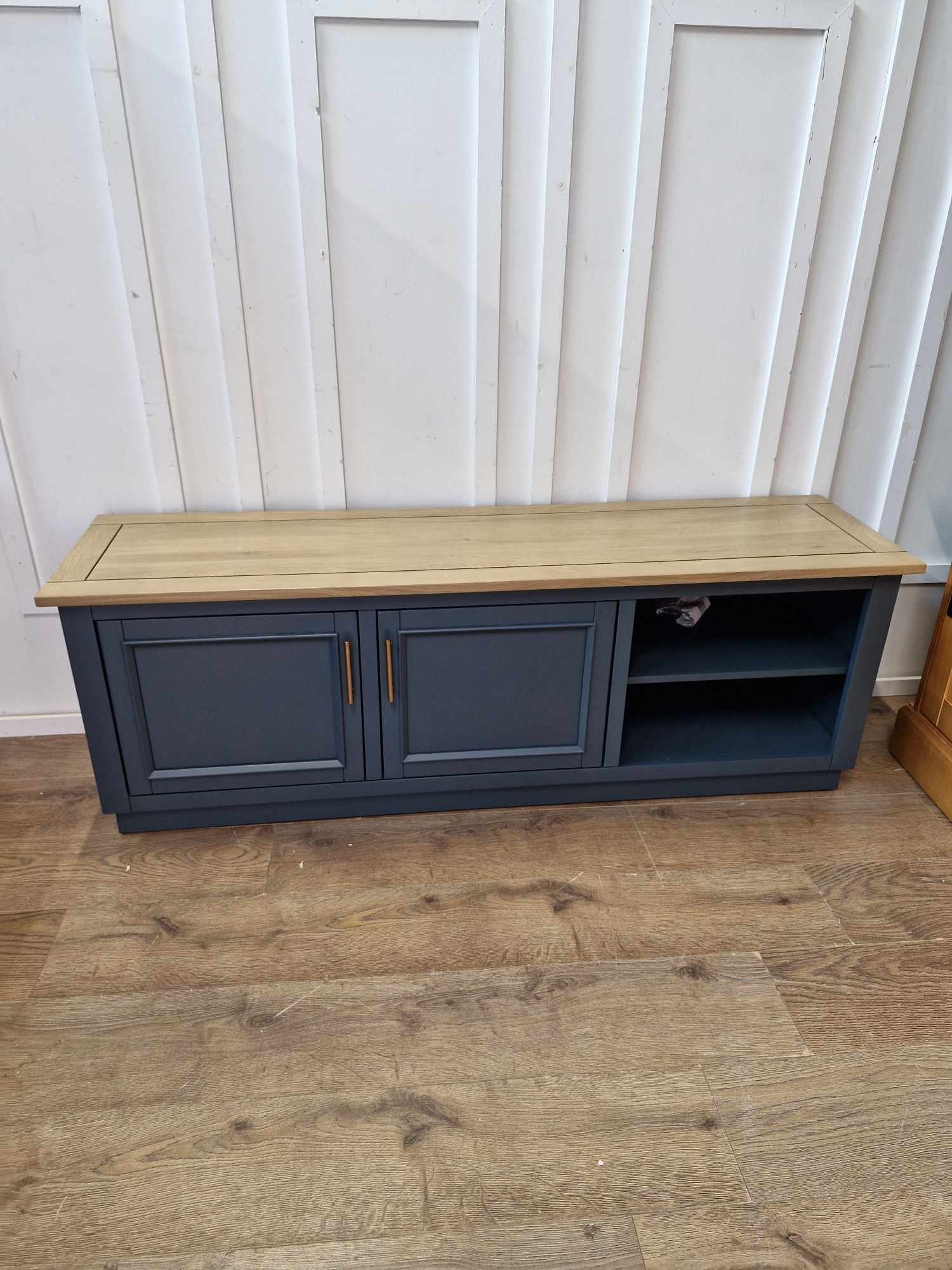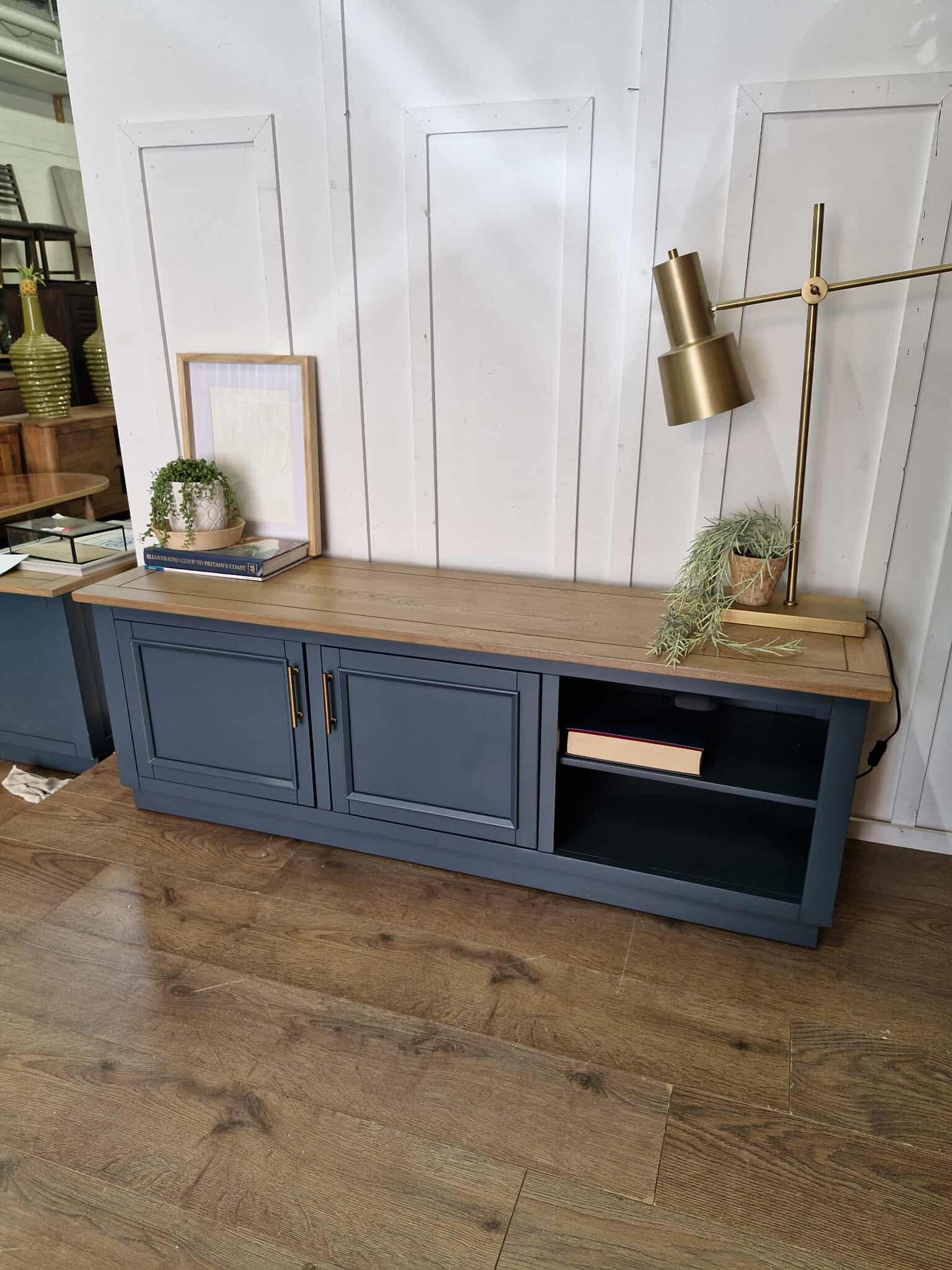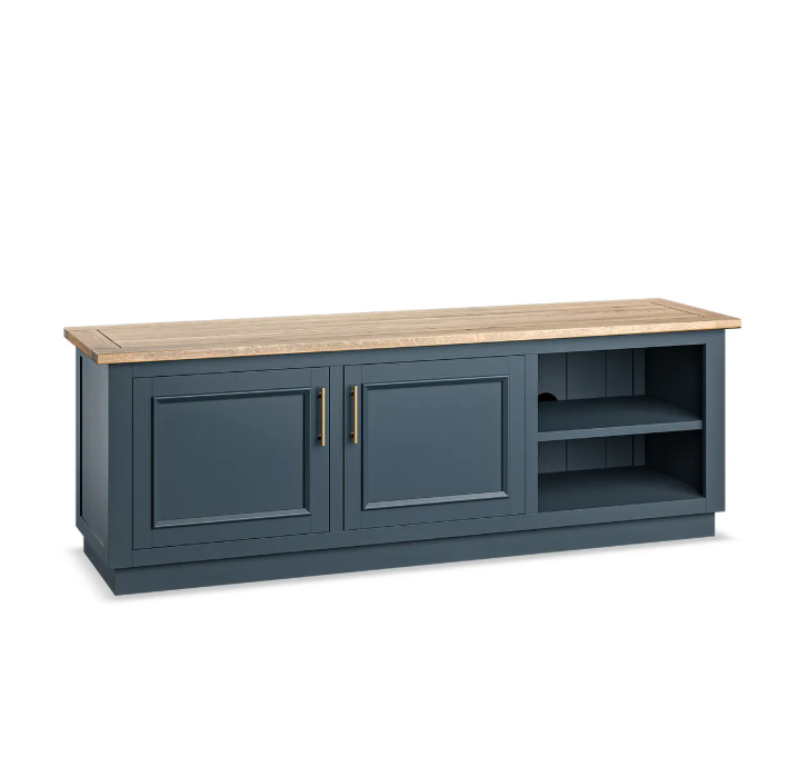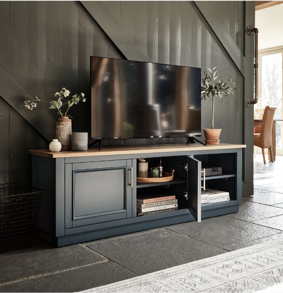 Large TV unit from Oak Furnitureland’s Richmond range, combining a smoked oak finish with deep ink blue painted hardwood. Offers generous storage with a mix of cupboard space and open shelves