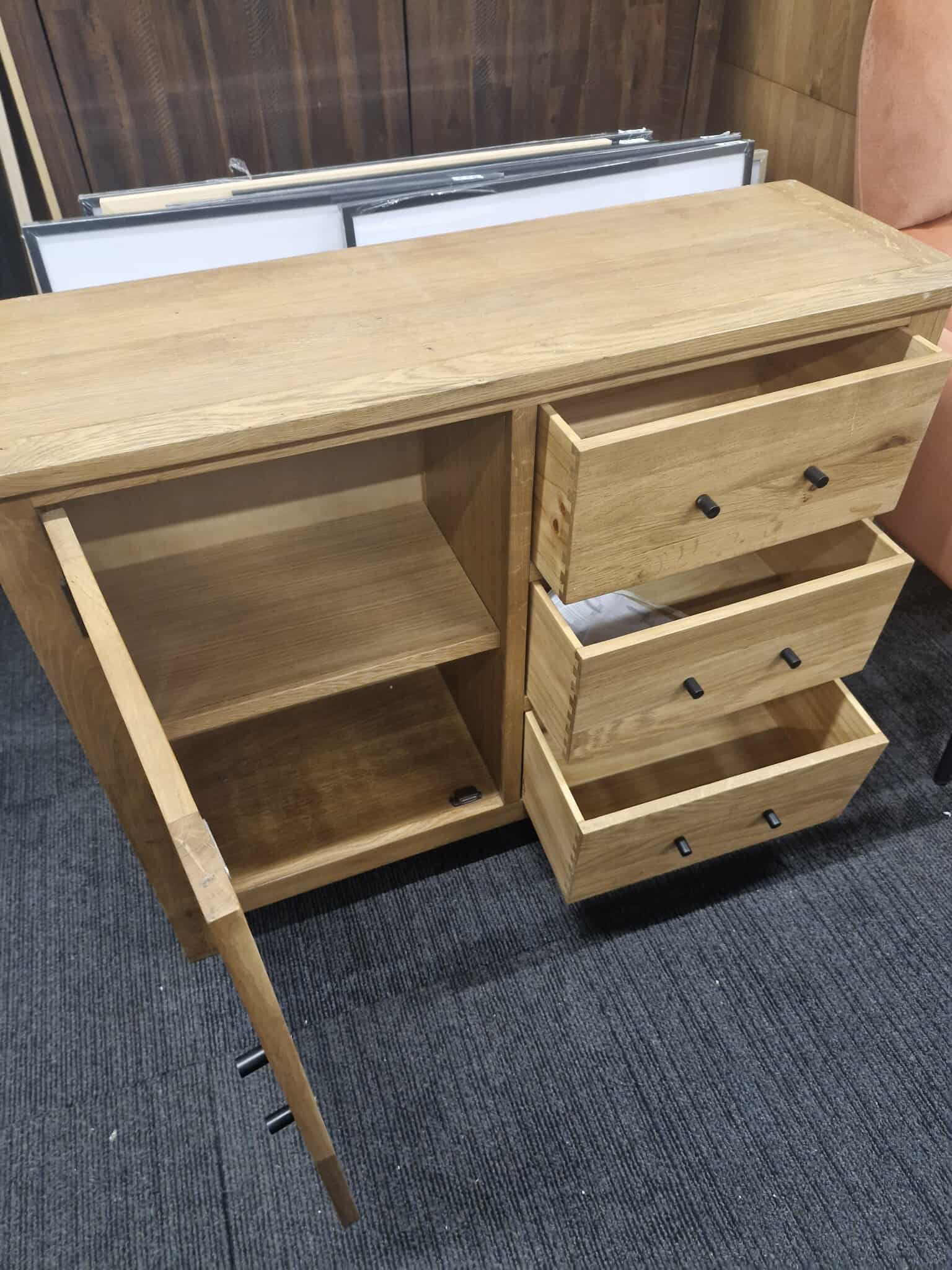 Great combination of storage behind the doors and 3 drawers