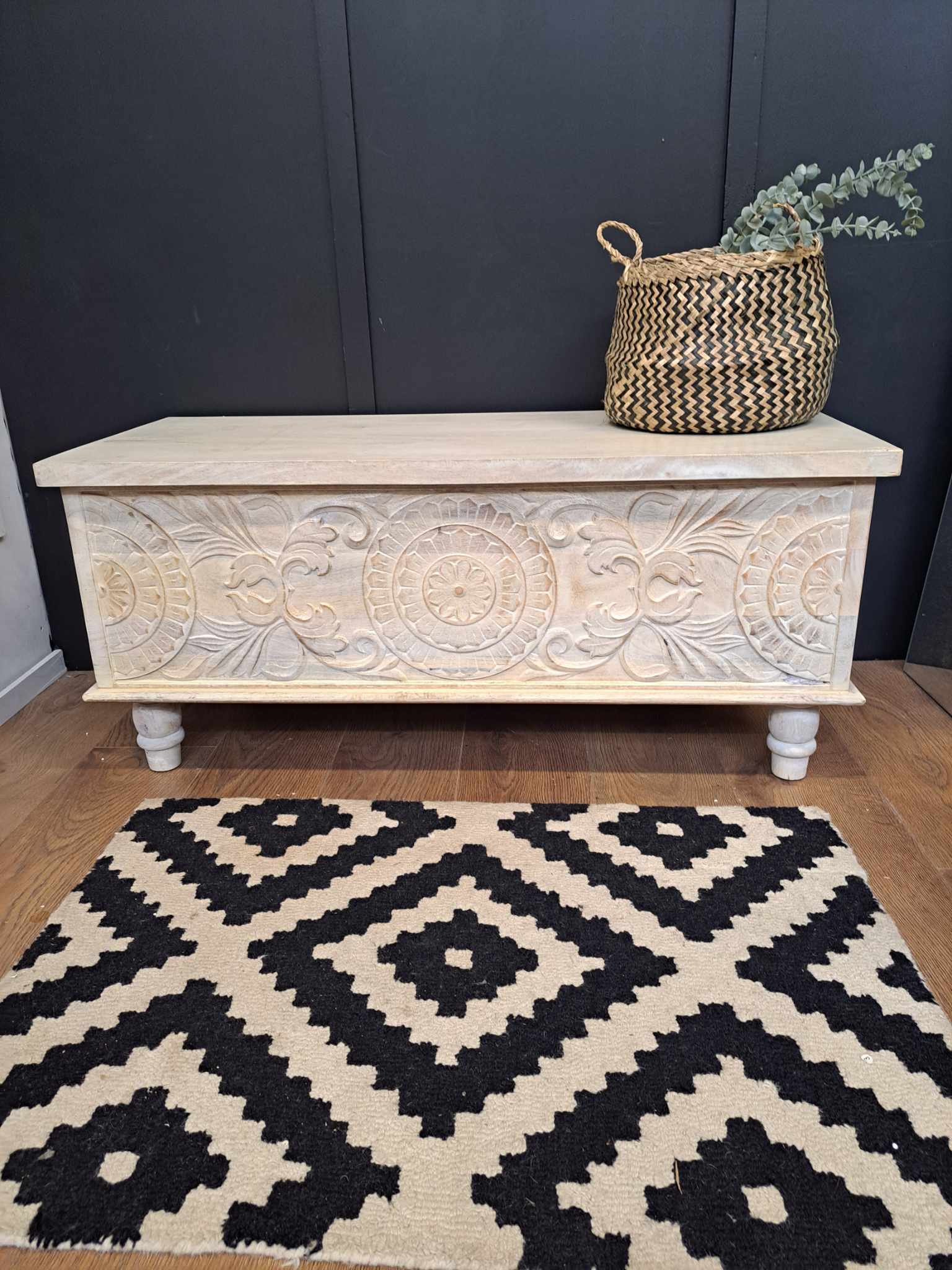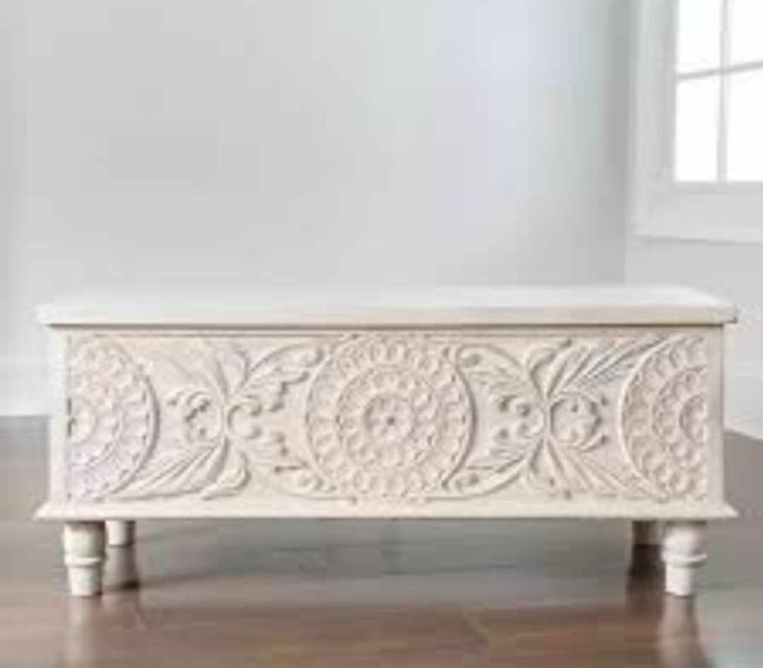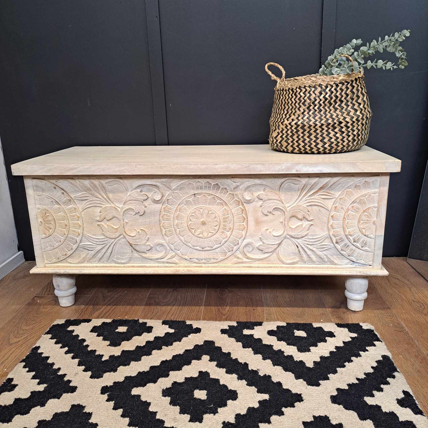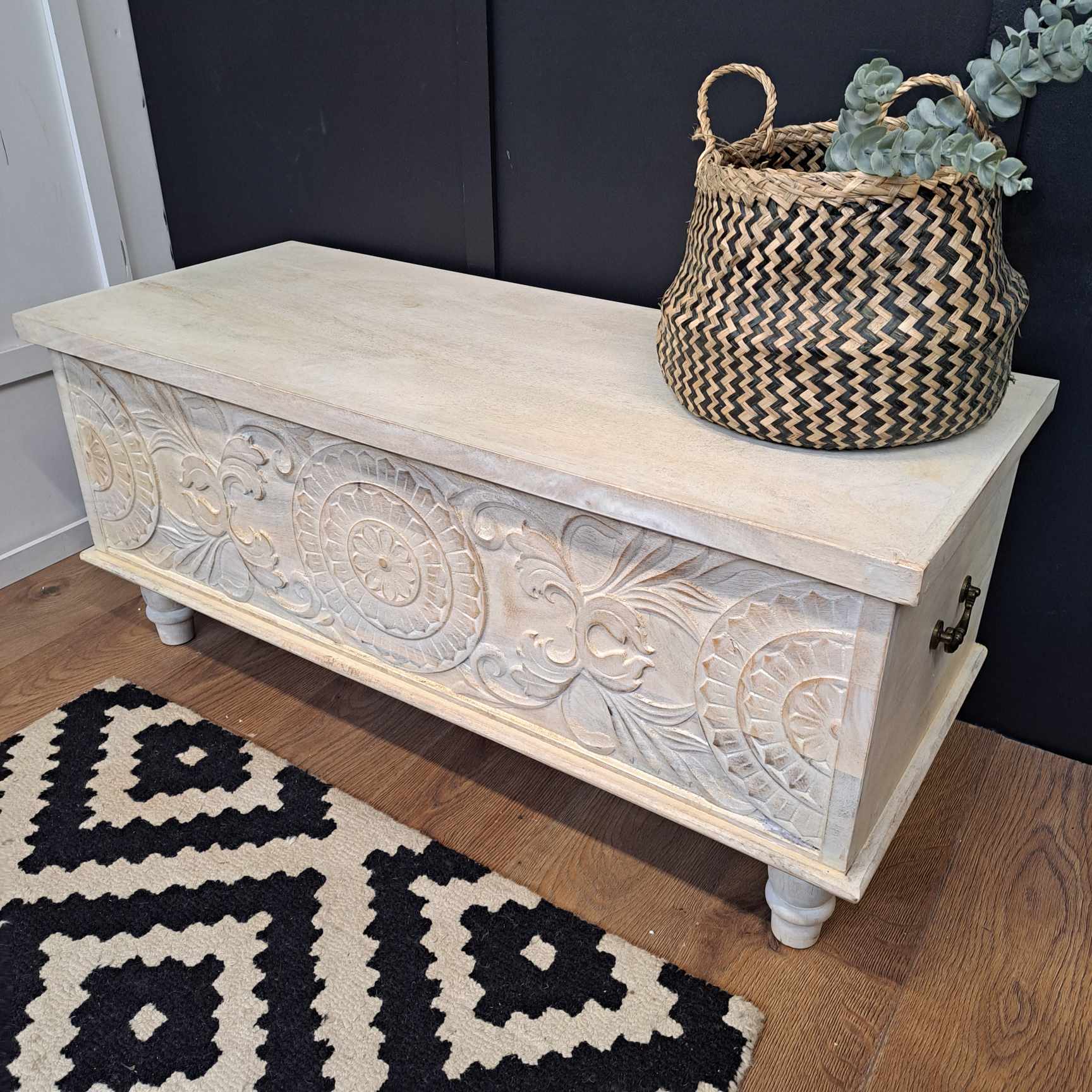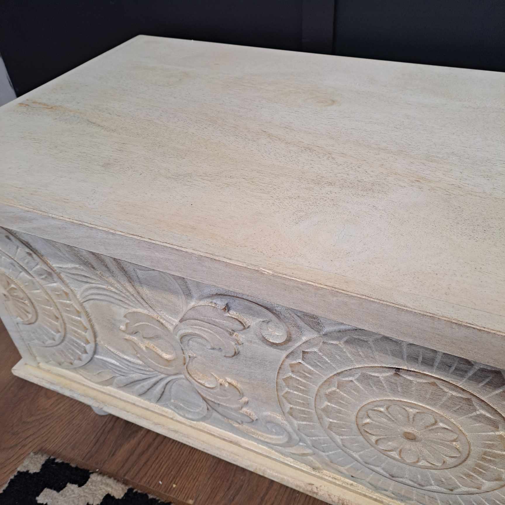 Solid Wood Carved Storage Chest / Washed White Acadia Wood Bench