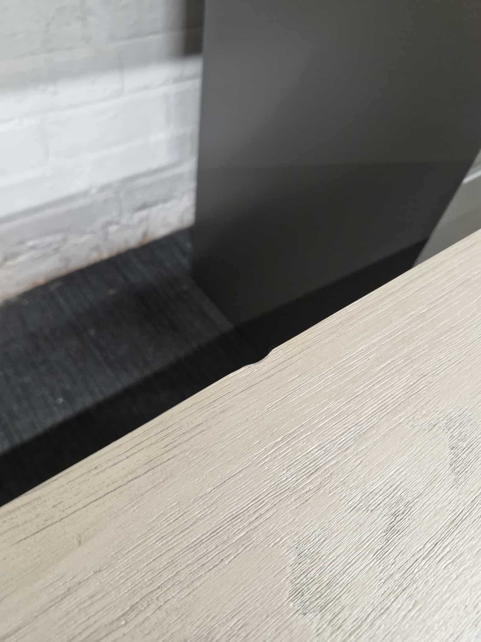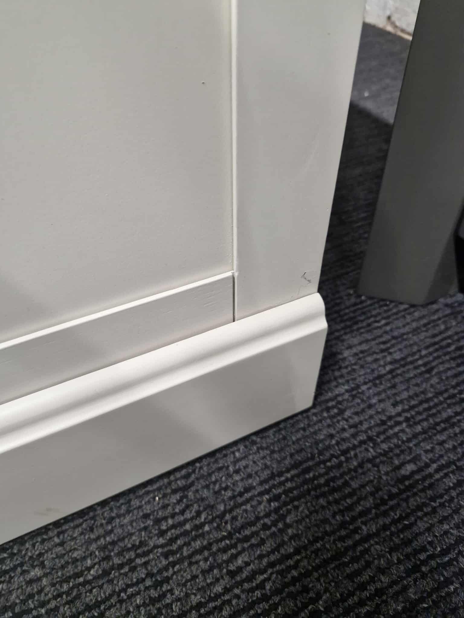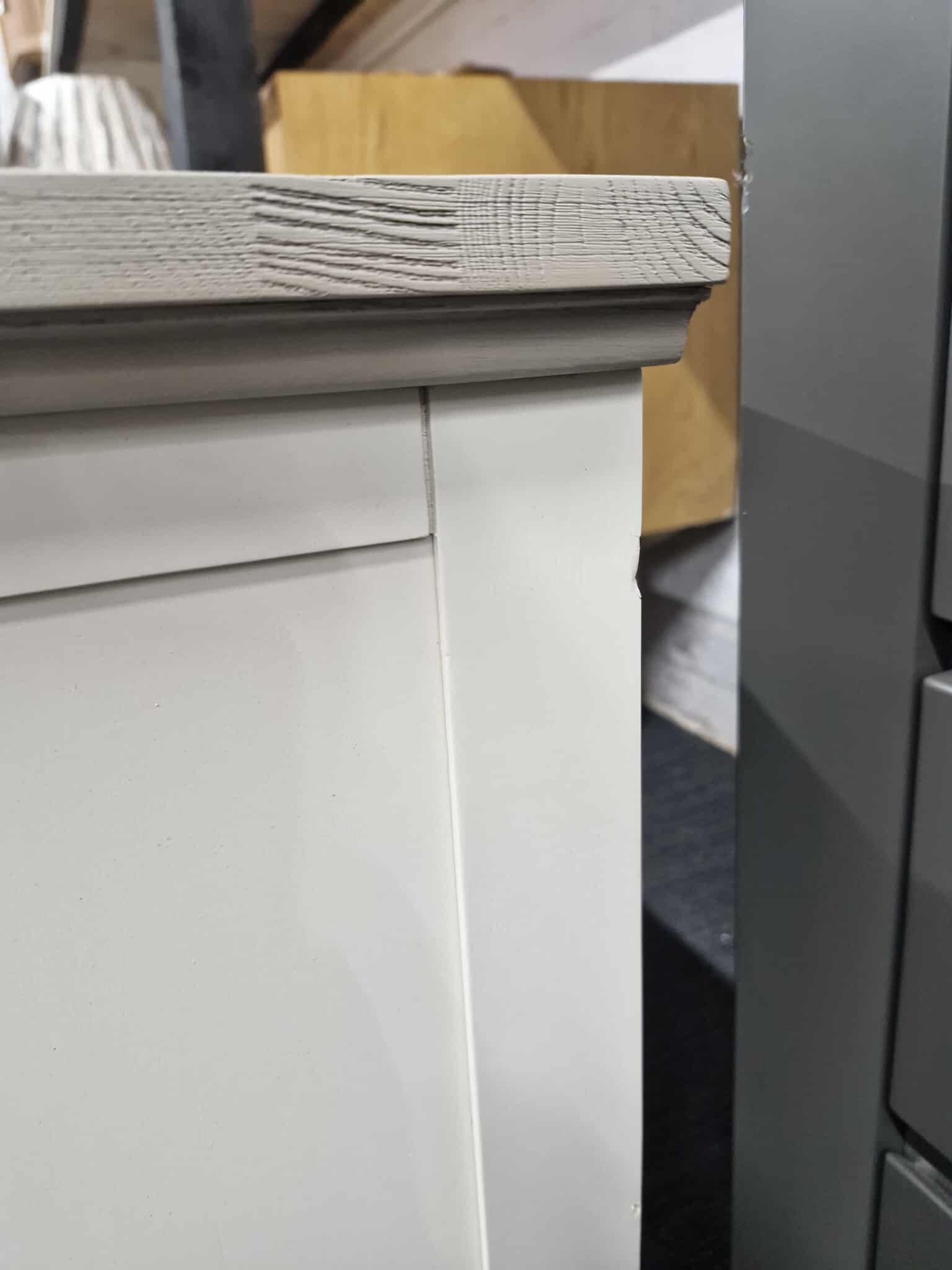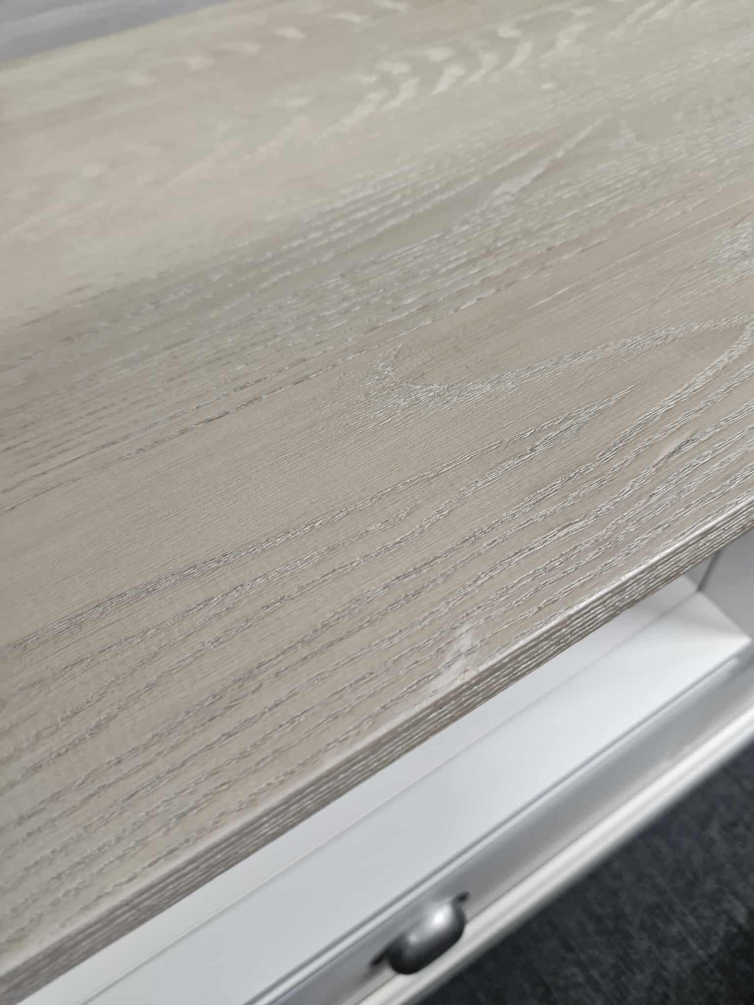 Classic and timeless collection is made from acacia that’s painted in a soft off-white and finished with solid ash lacquered tops.