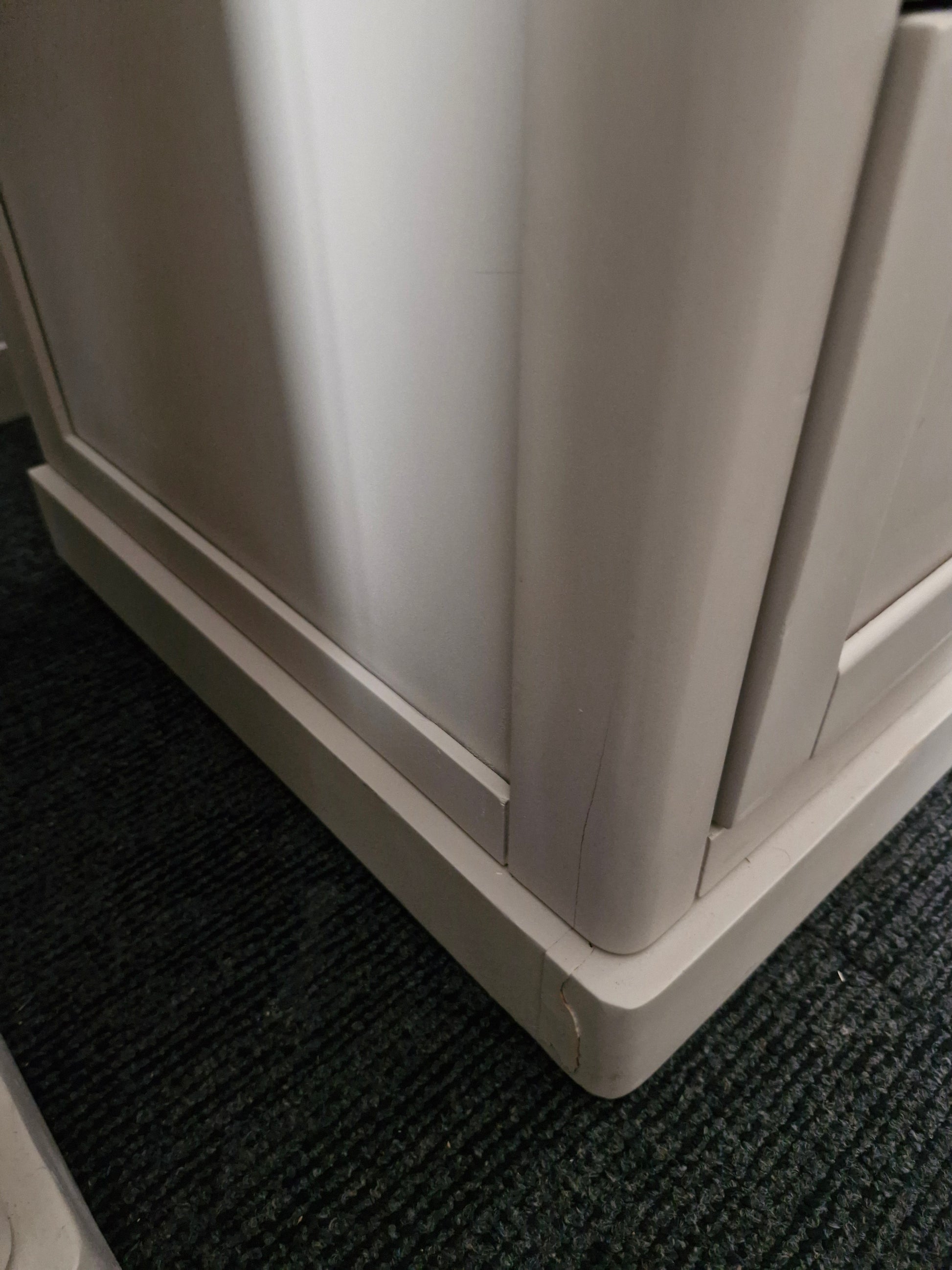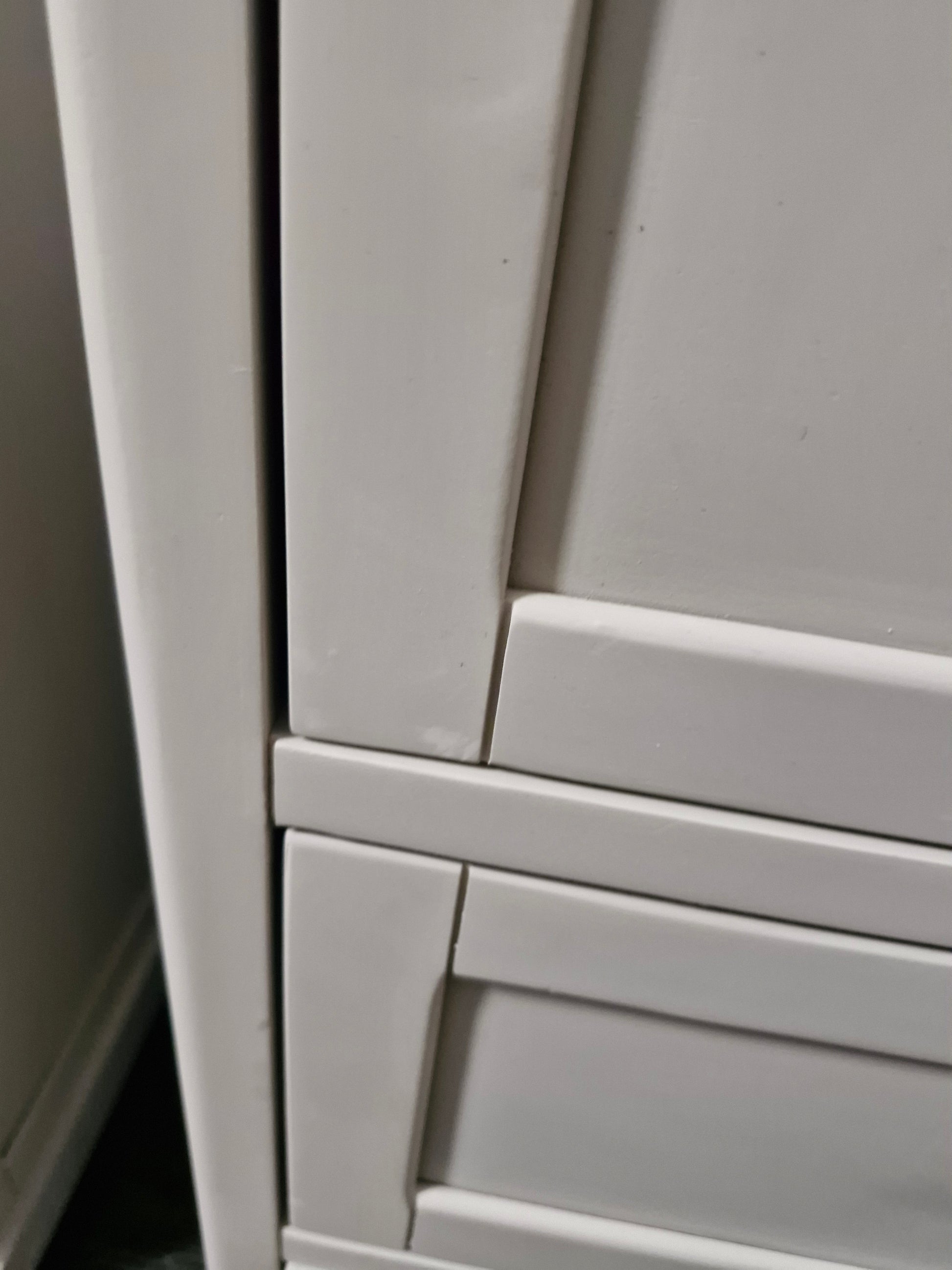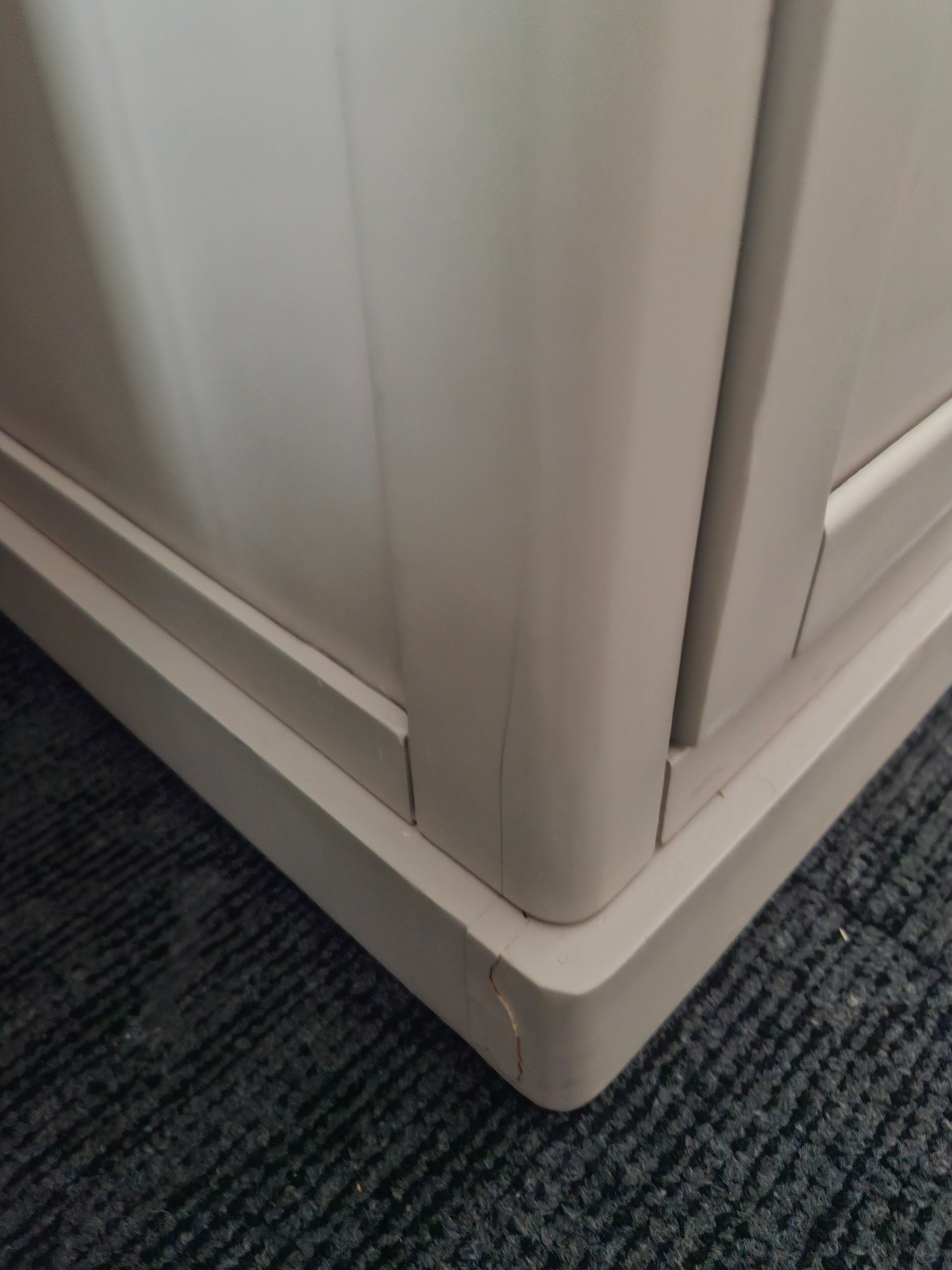 Some imperfections: chip off the base, thin crack line at the door and some small dent marks