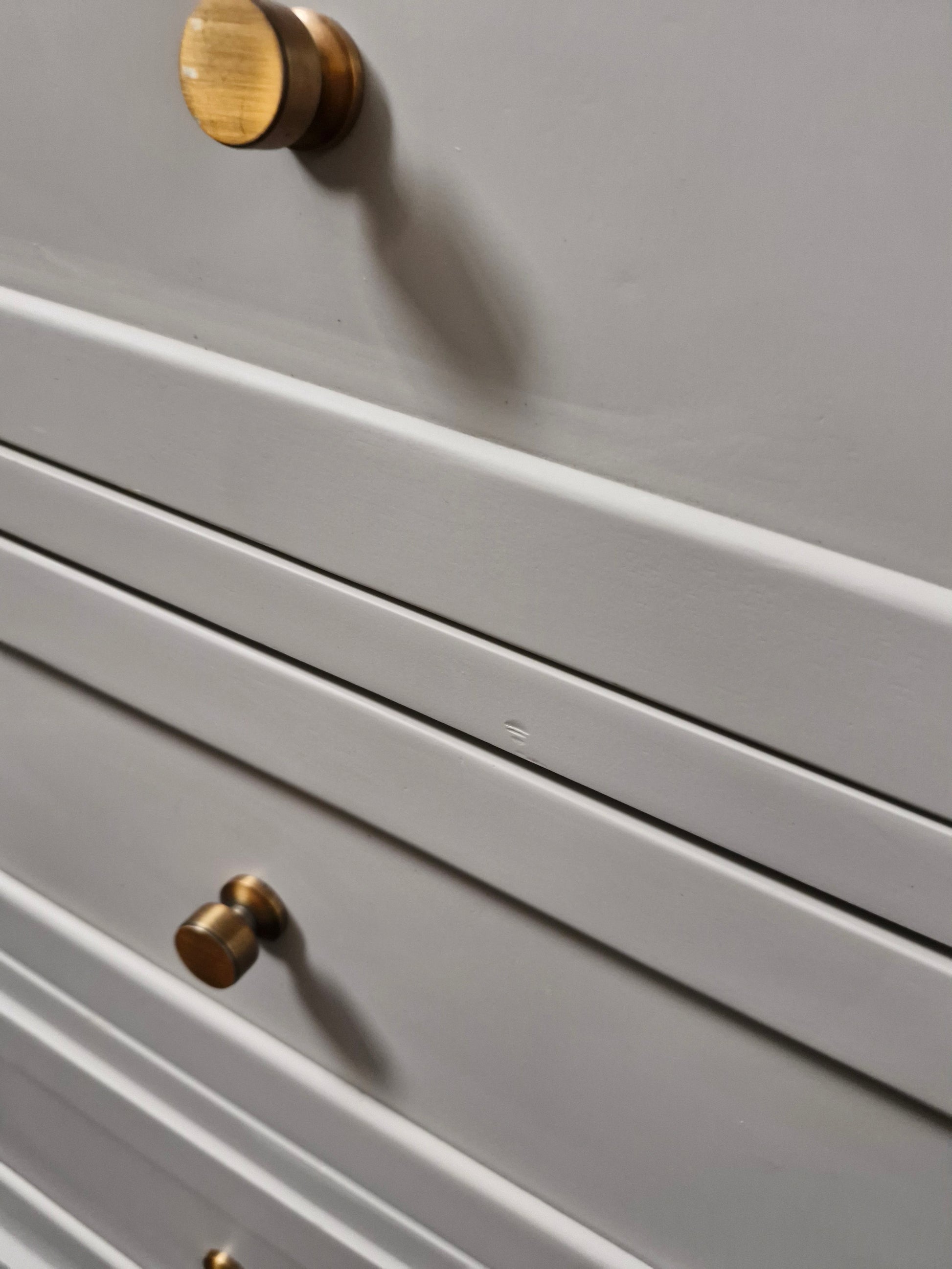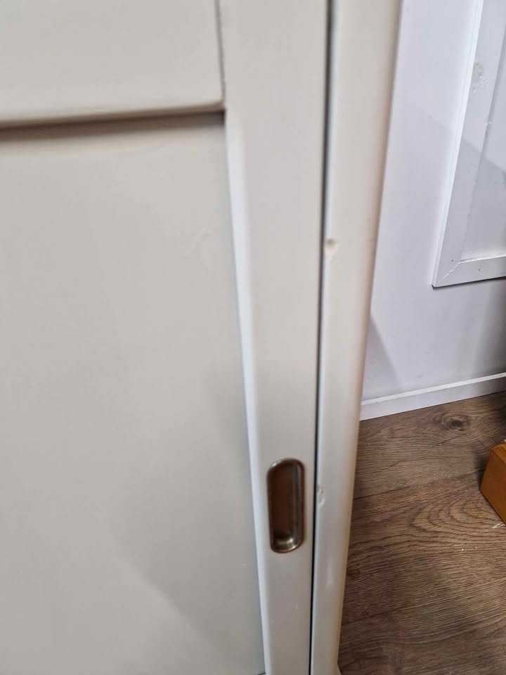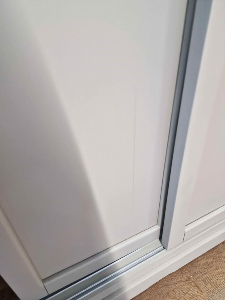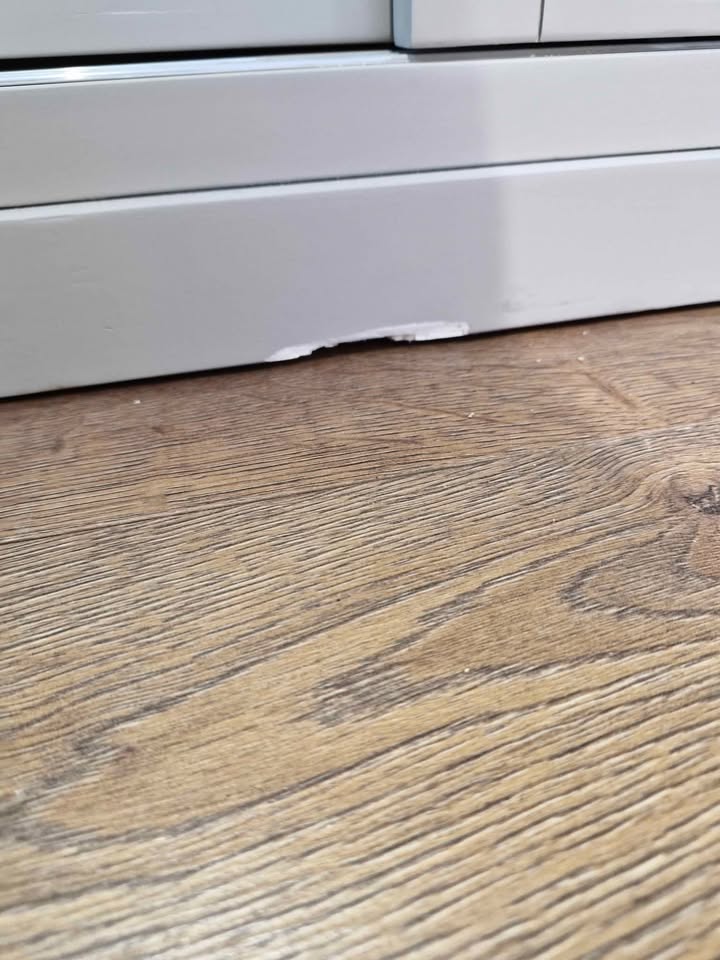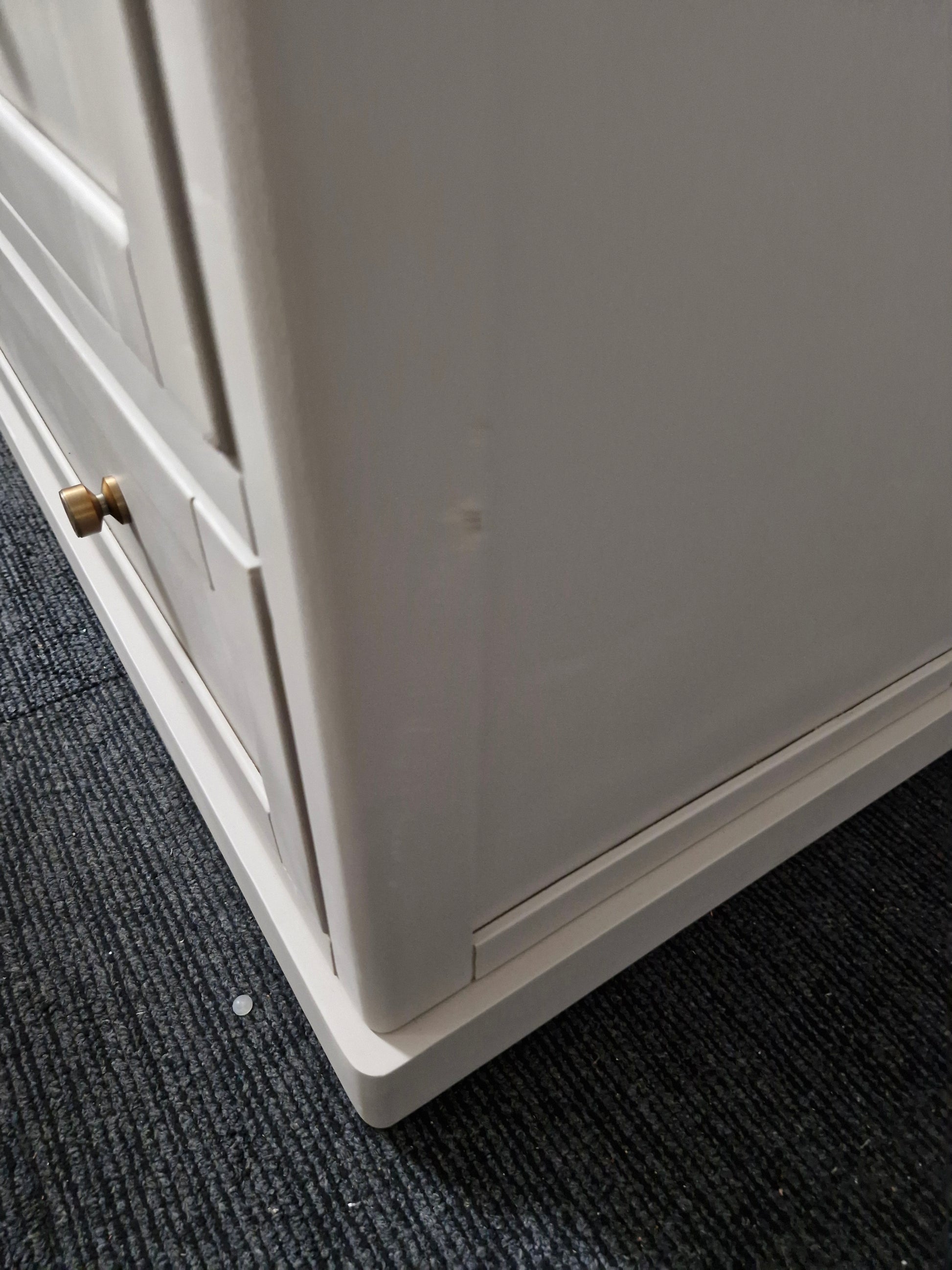Some imperfections: chip off the base, thin crack line at the door and some small dent marks