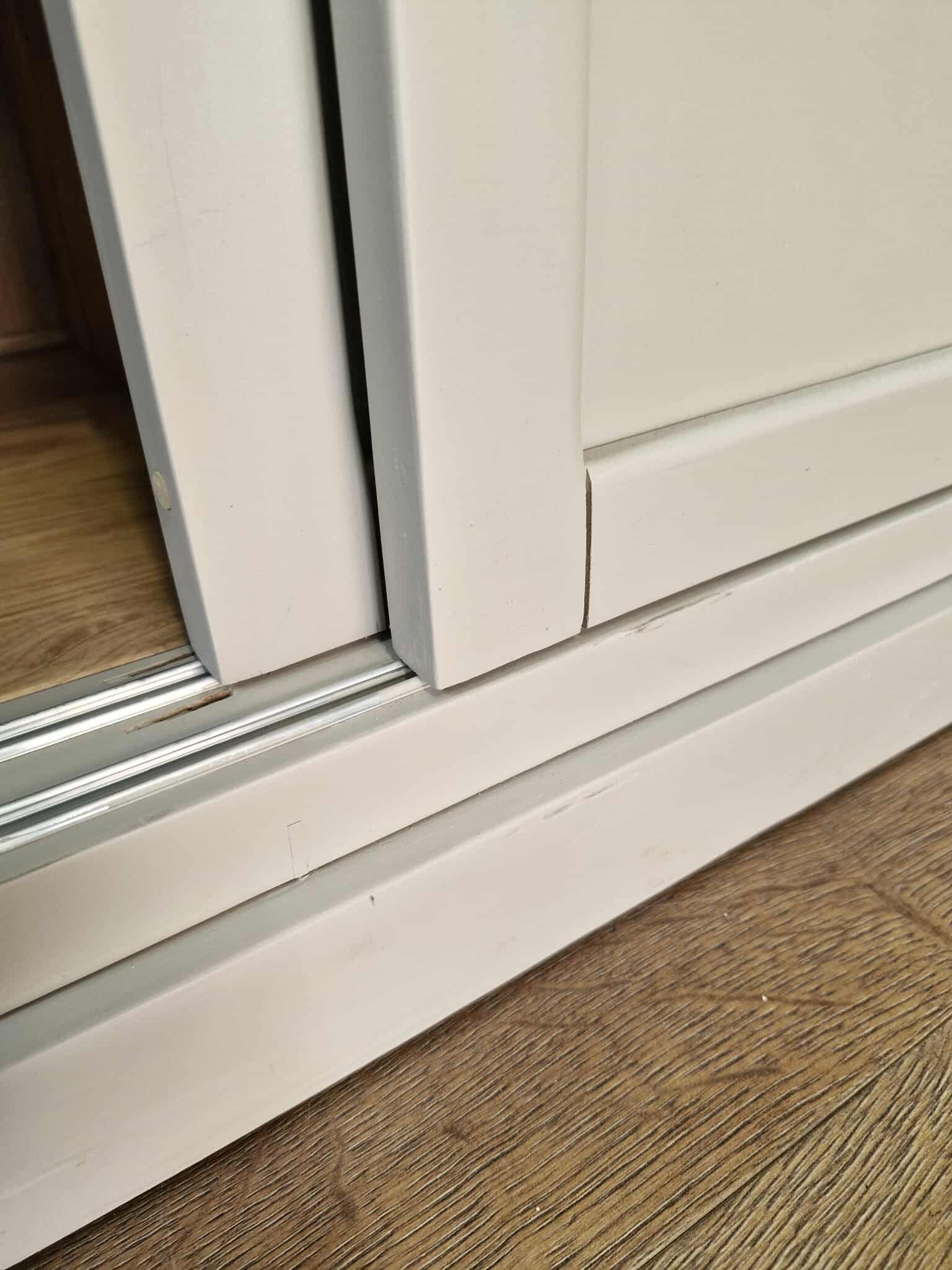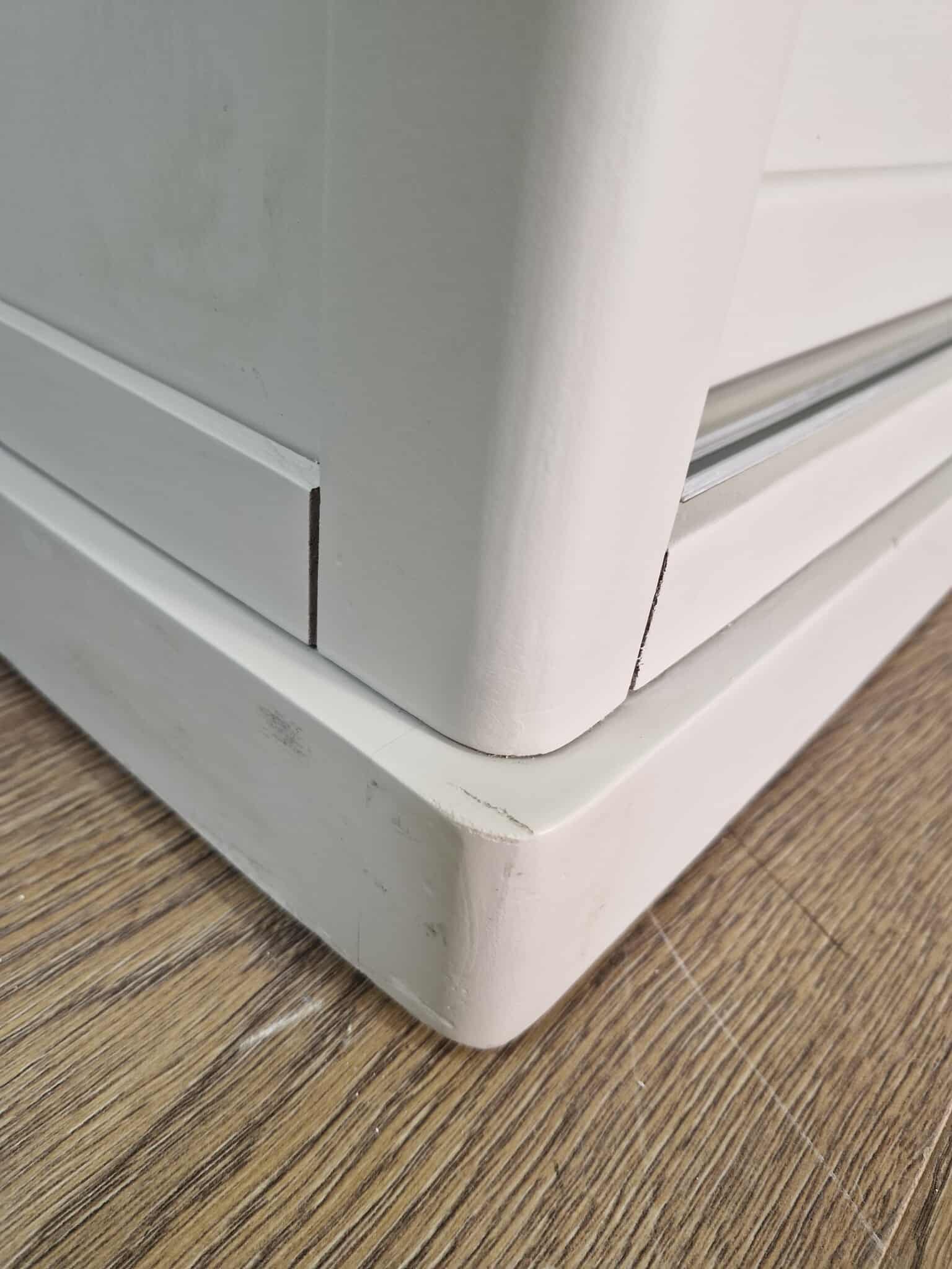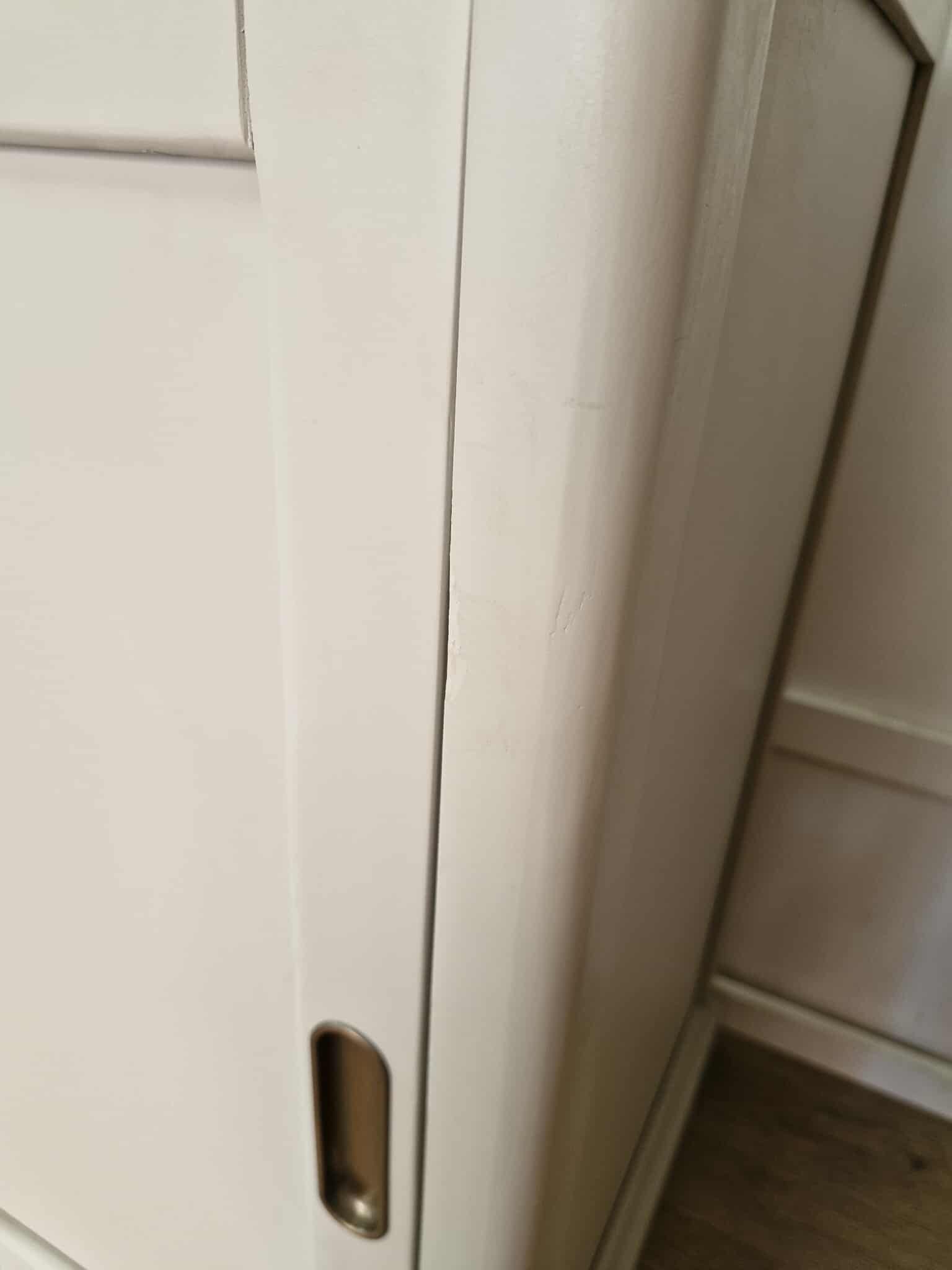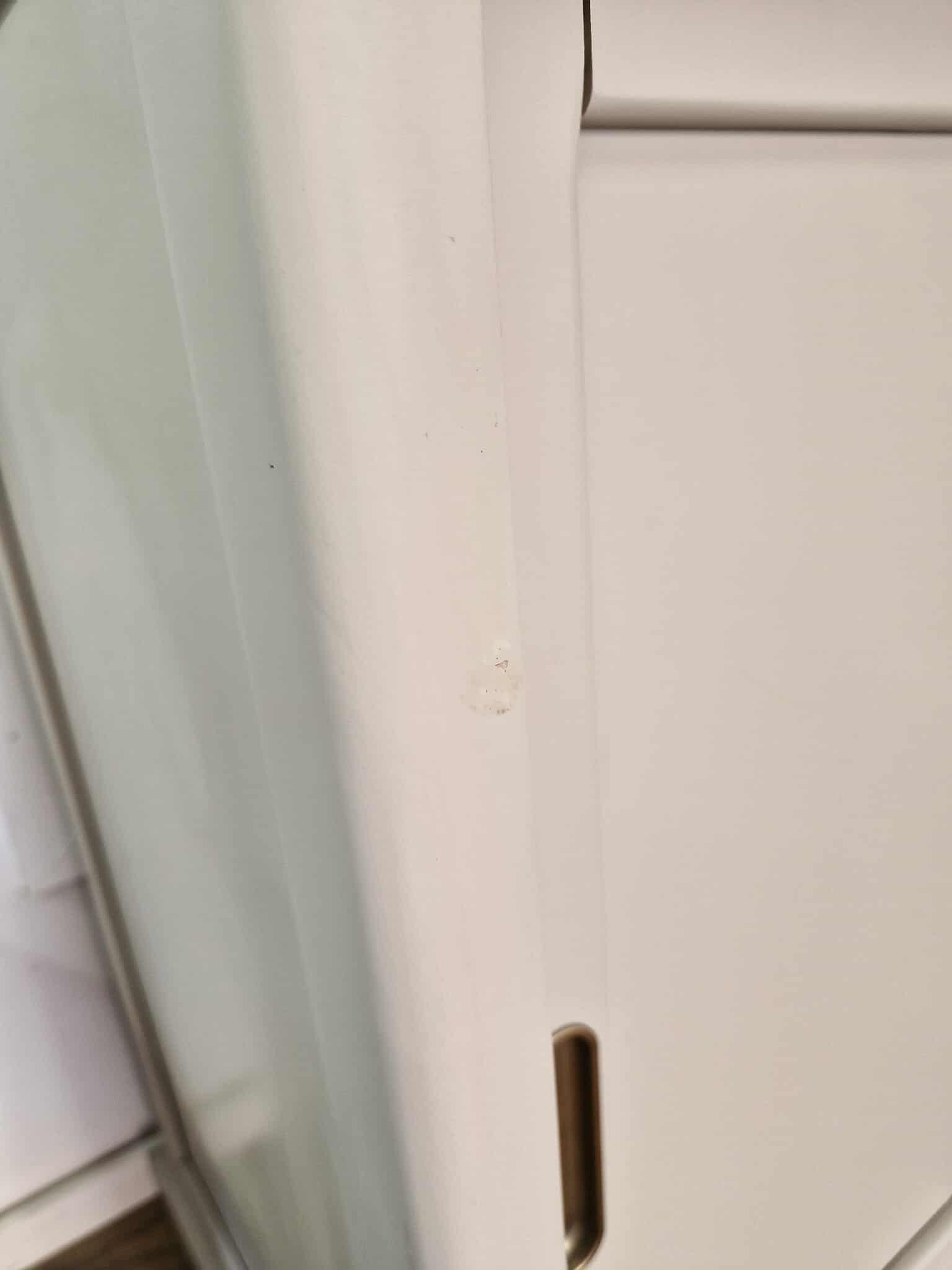 Some imperfections: chip off the base, thin crack line at the door and some small dent marks