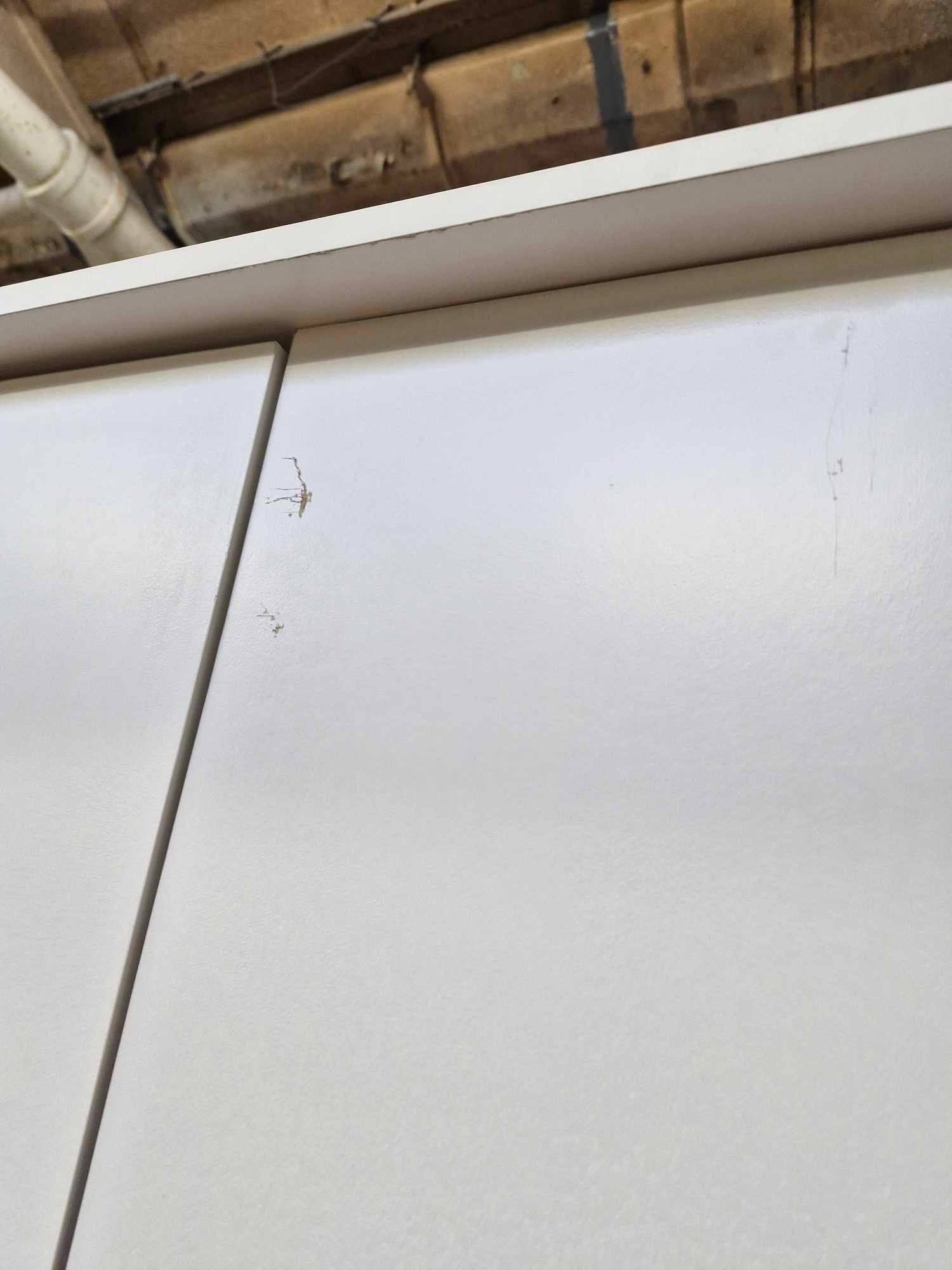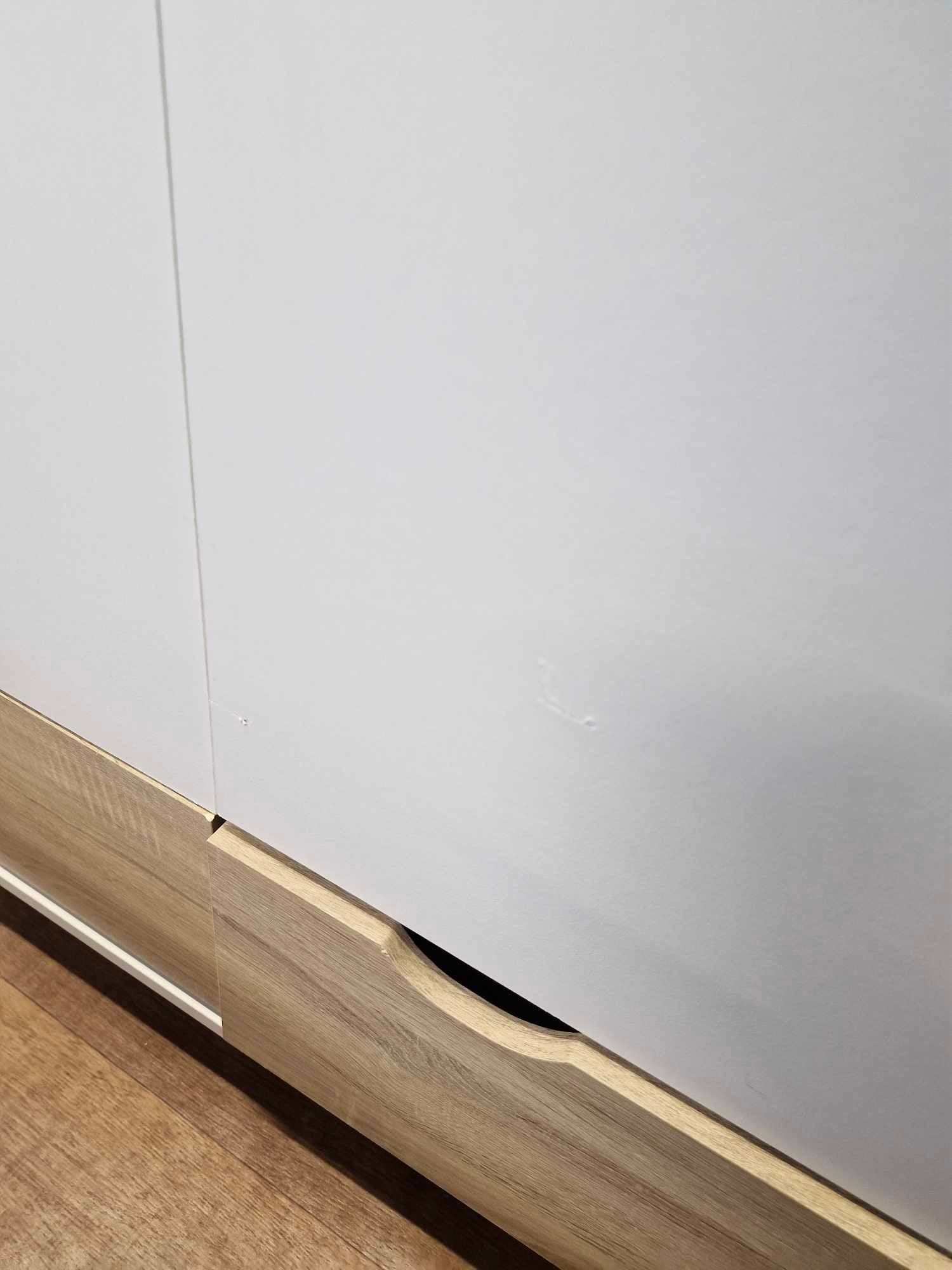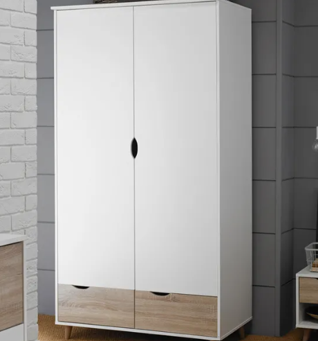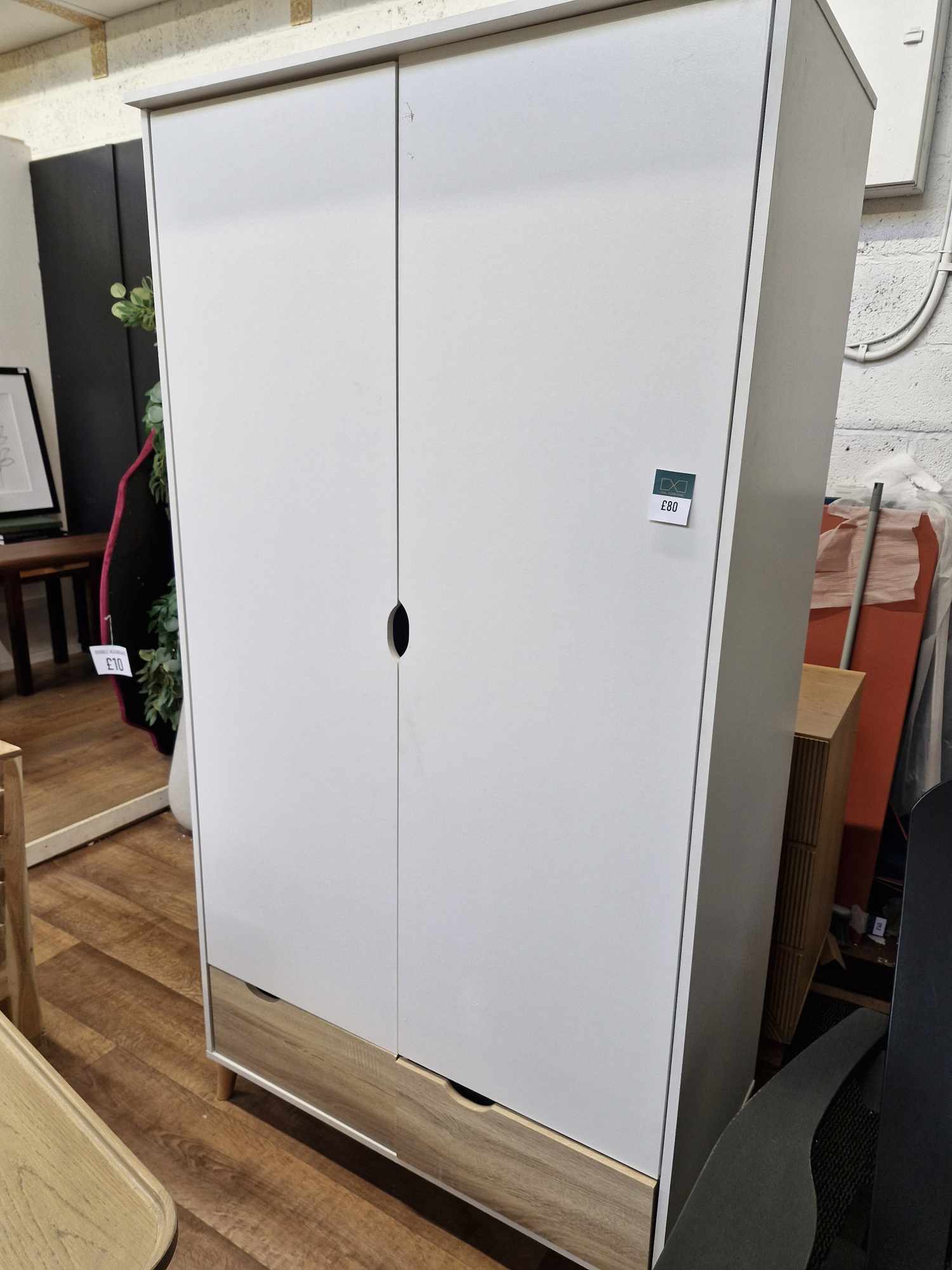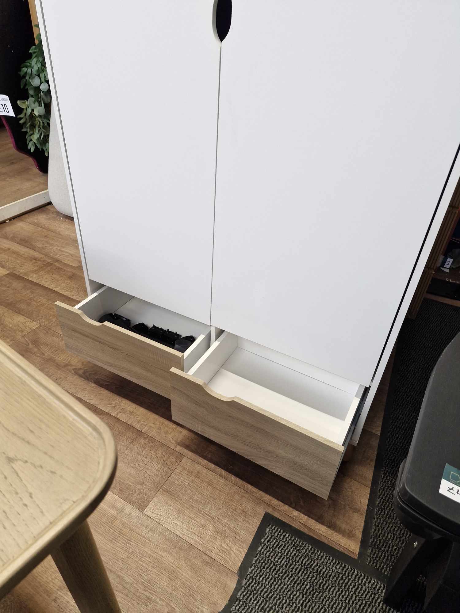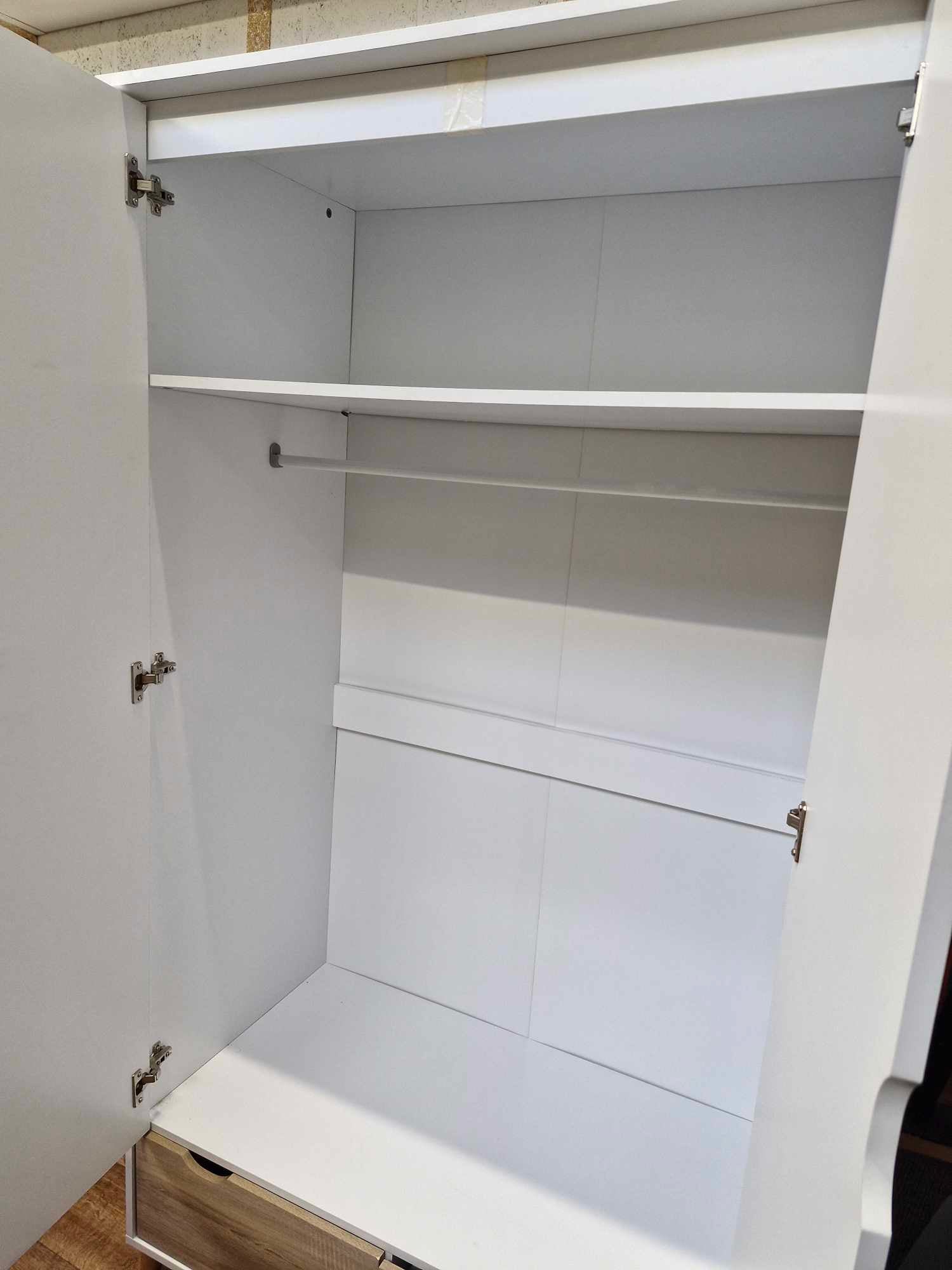 White and wood effect double wardrobe with drawers, hanging rail and shelf